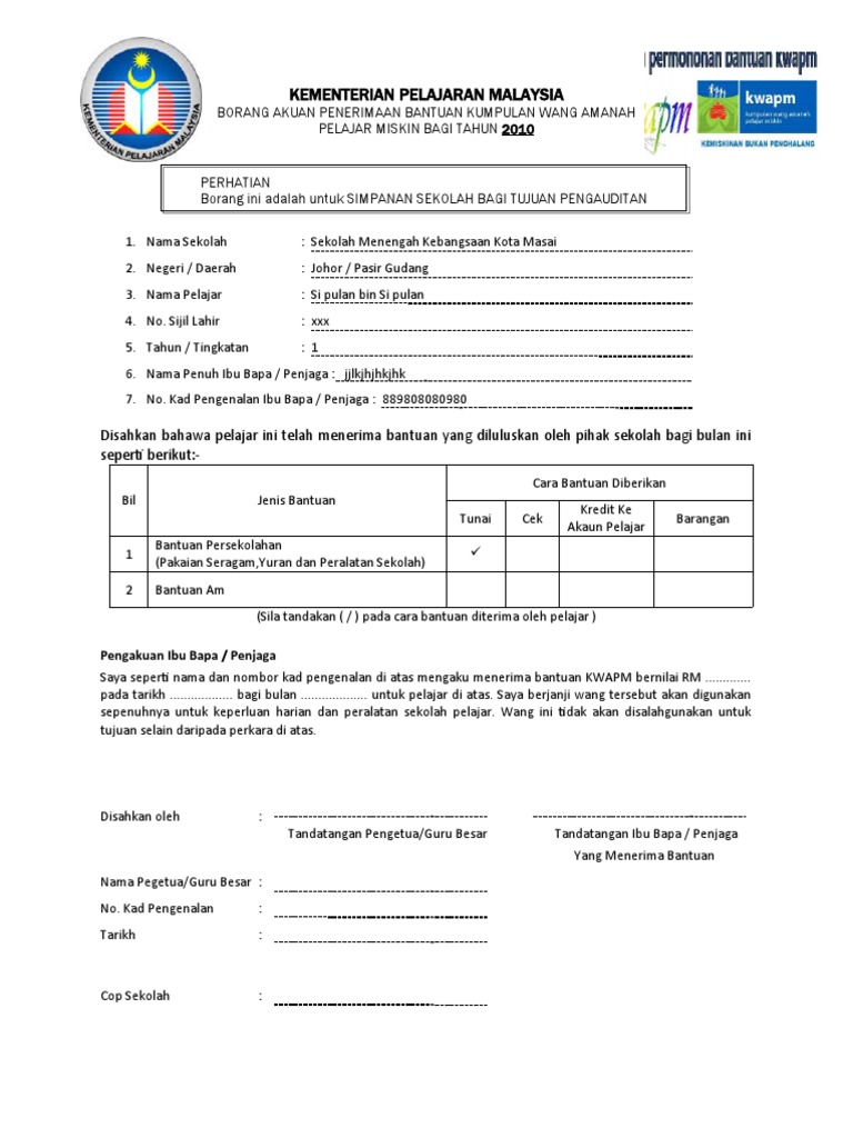 Related : Borang Akuan Penerimaan Kwapm : Saya seperti nama dan nombor kad pengenalan di atas mengaku menerima bantuan kwapm bernilai rm 200.00 pada tarikh..