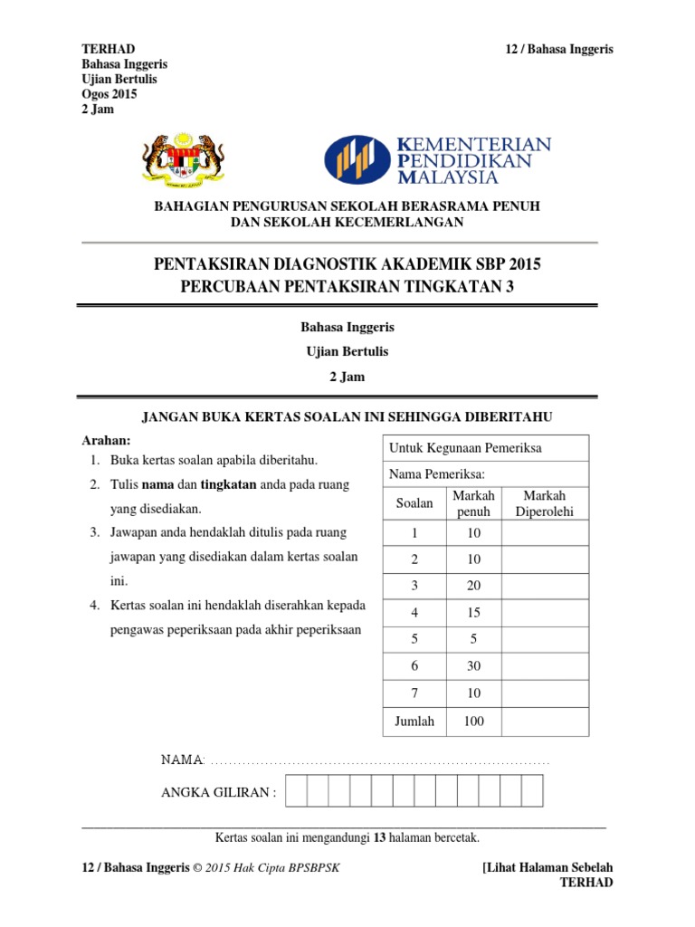 Related : Soalan Bahasa Inggeris Pt3 2015 / Percubaan pentaksiran tingkatan 3 bahasa inggeris ujian bertulis 2 jam jangan buka kertas soalan ini sehingga diberitahu arahan:.