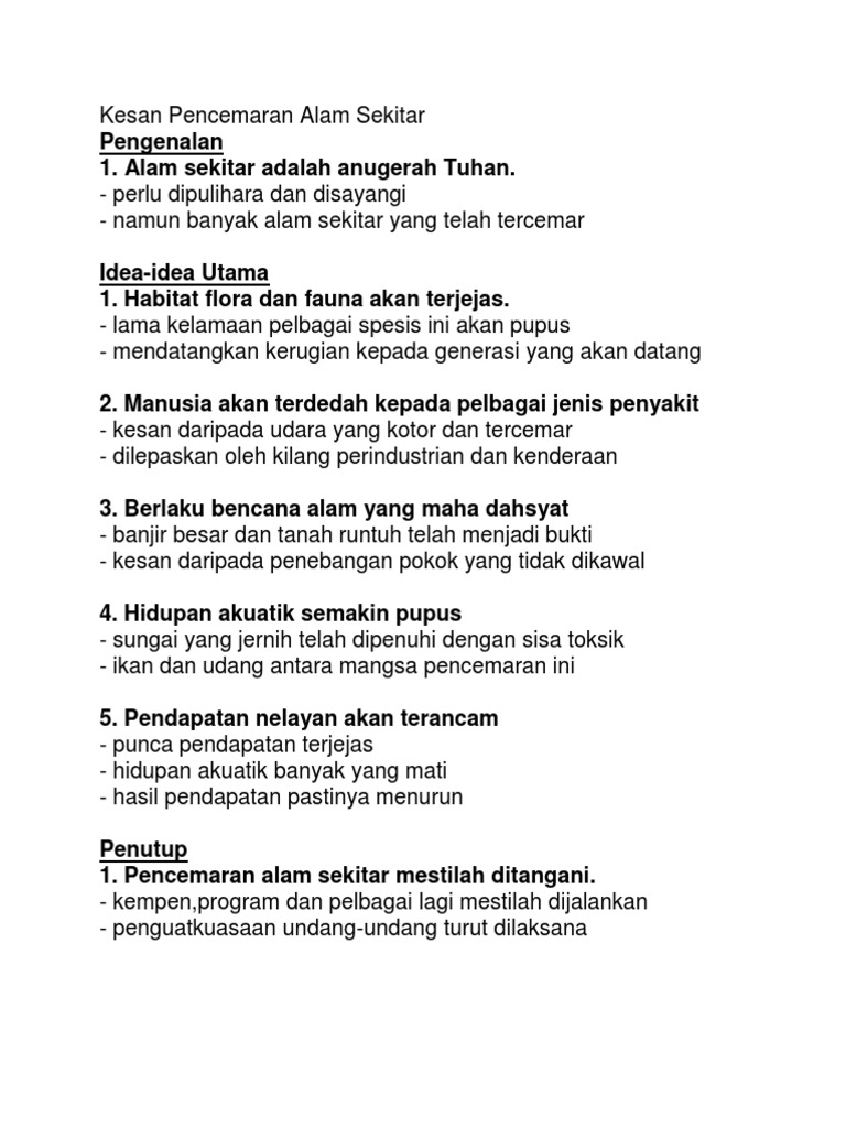 Terdapat pelbagai cara pencemaran boleh berlaku. Amalan harian di rumah 3. Dimana antara kesan yang dianggap kronik akaibat pencemaran air yang berlaku adalah anomalia, iaitu pembesaran tubuh dan tingkahlaku yang tidak normal, serta kurang daya ketahanan badan akibat penggunaan sumber air tersebut. Namun demikian, pencemaran alam sekitar kian bertambah. Kempen kempen mencintai alam sekitar yang disiarkan dalam tv dan radio hendaklah dihayati supaya alam sekitar kita terpelihara. Penggunaan bahan api fosil yang tidak terkawal. Pencemaran marin berlaku apabila berlaku tumpahan cecair petroleum hydrocarbon alam laut atau persisiran pantai akibat dari aktiviti manusia. Di negara kita misalnya penggunaan kereta masa kini telah bertambah dengan begitu pesat antara kesan pencemaran yang banyak membunuh organisma laut di perairan cetek ialah kesan daripada tumpahan minyak ke laut. Buktinya, para pengkaji menjumpai kesan terbakar di dinding gua tempat manusia tinggal pada zaman dahulu. Alam sekitar memainkan peranan yang penting dalam kehidupan manusia. Manusia akan terdedah kepada pelbagai jenis penyakit. Pencemaran alam sekitar telah memberi kesan yang buruk terhadap hidupan di dunia pada masa kini. Pendidikan alam sekitar mula diperkenalkan secara formal pada peringkat rendah melalui kurikulum bersepadu sekolah rendah kbsr dalam matapelajaran alam dan manusia.